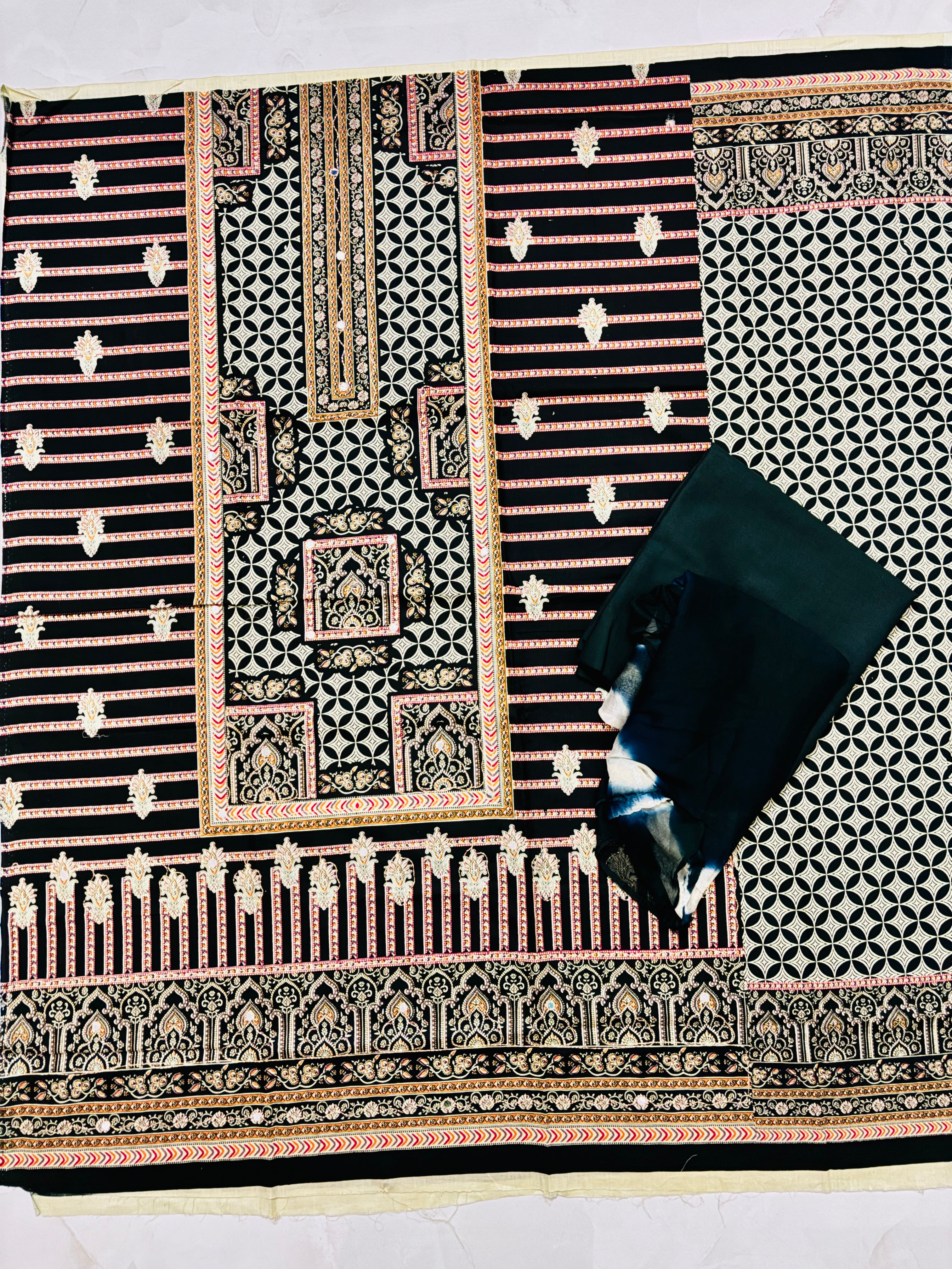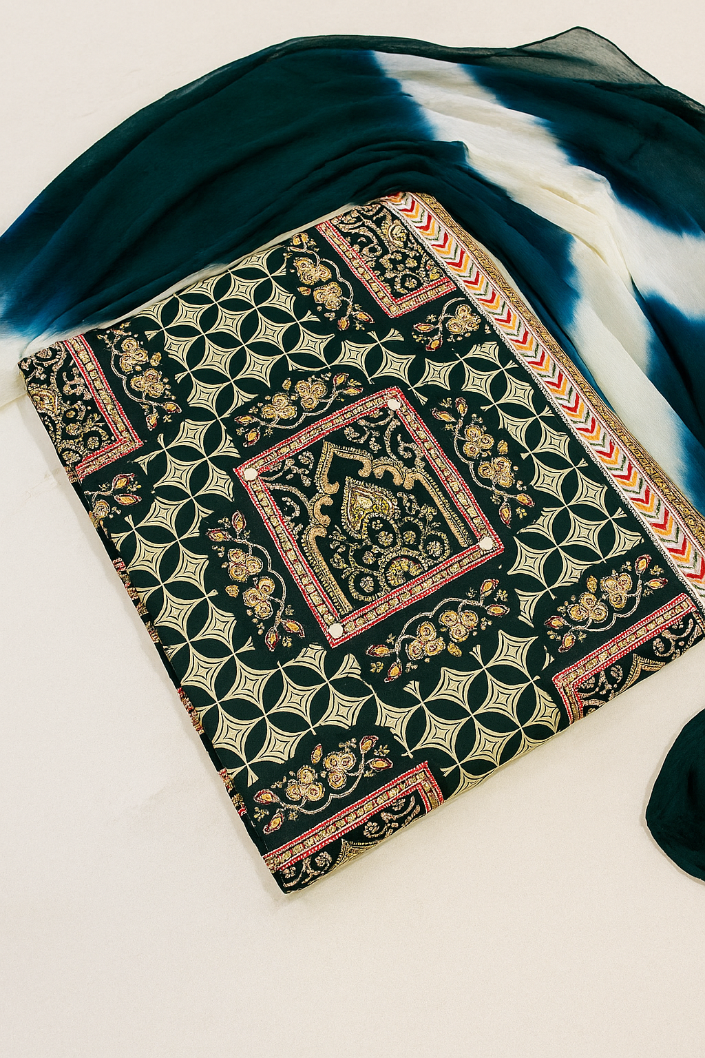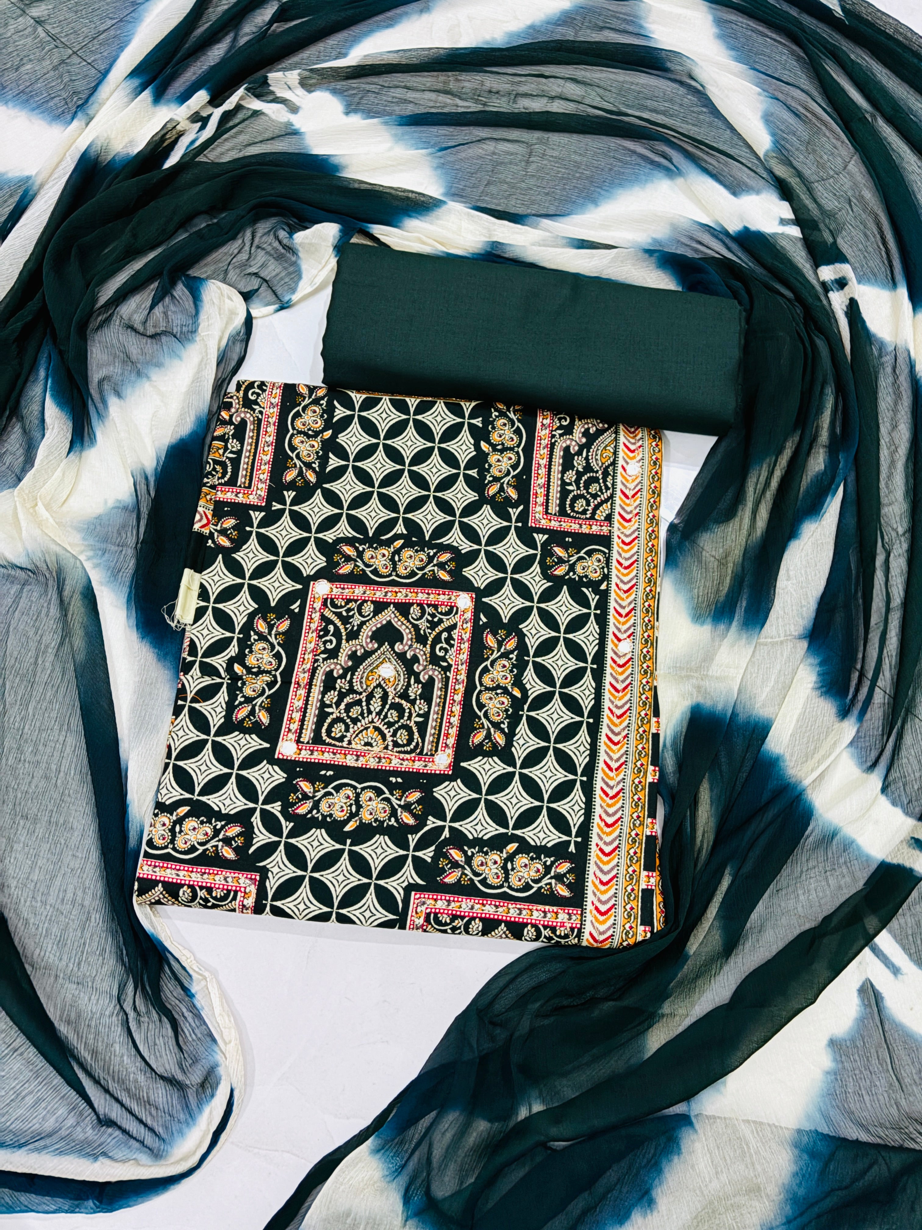 Step into classic elegance with this unstitched cotton suit set in a deep dark green base, beautifully adorned with intricate cream and pink ethnic motifs. The kurta showcases a blend of traditional stripes, floral butis, and geometric patterns, finished with ornate border detailing and a highlighted neckline. Paired with a solid dark green bottom and a shaded dupatta in tones of green and white, this outfit strikes the perfect balance between tradition and style.Soft breathable top and bottom fabrics with chiffon two shaded dupatta.Size fits upto xxxl