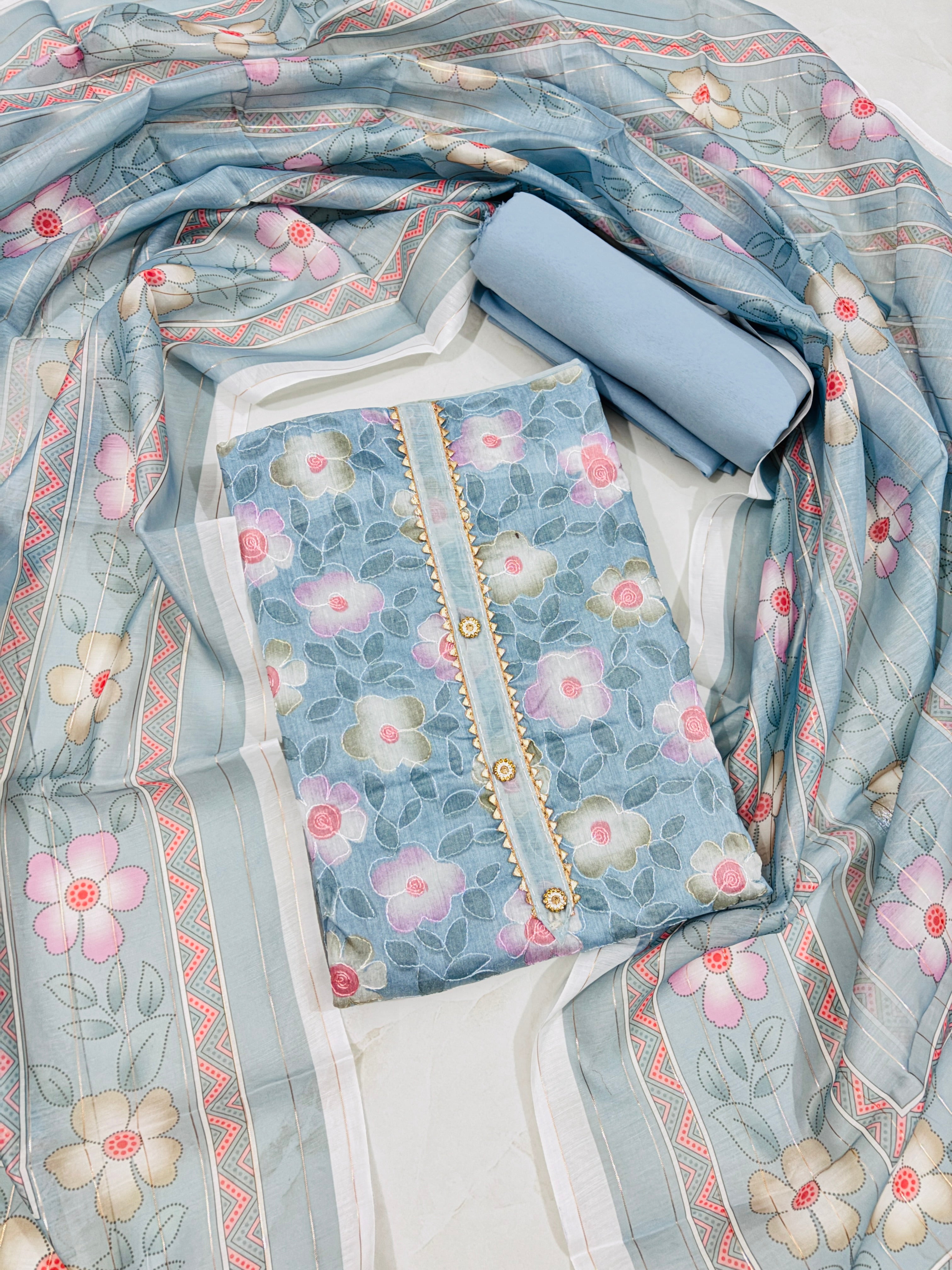 The combination of floral prints and soft colours creates a feminine and elegant appearance, suitable for casual or festive occasions.The dupatta has a blue base with a floral design, complemented by decorative borders that echo the floral theme.Fabric is cotton blend ideal for all the seasons.Size fits upto xxl