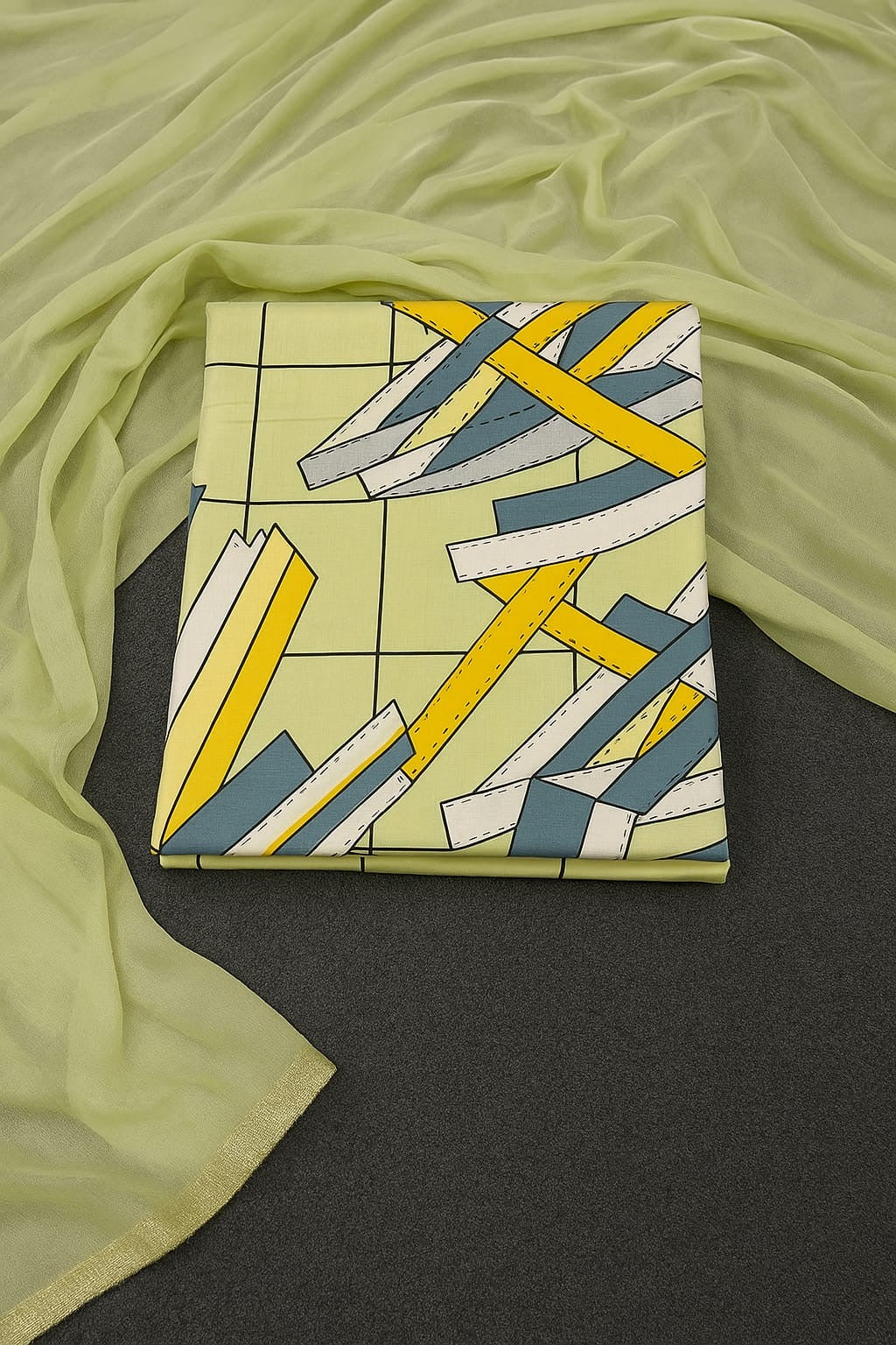 Predominantly light yellow tones with soft green accents.Features a modern geometric pattern with intersecting lines in various colors (yellow, blue, white).The combination of modern prints with traditional elements creates a versatile outfit suitable for casual and semi-formal occasions.