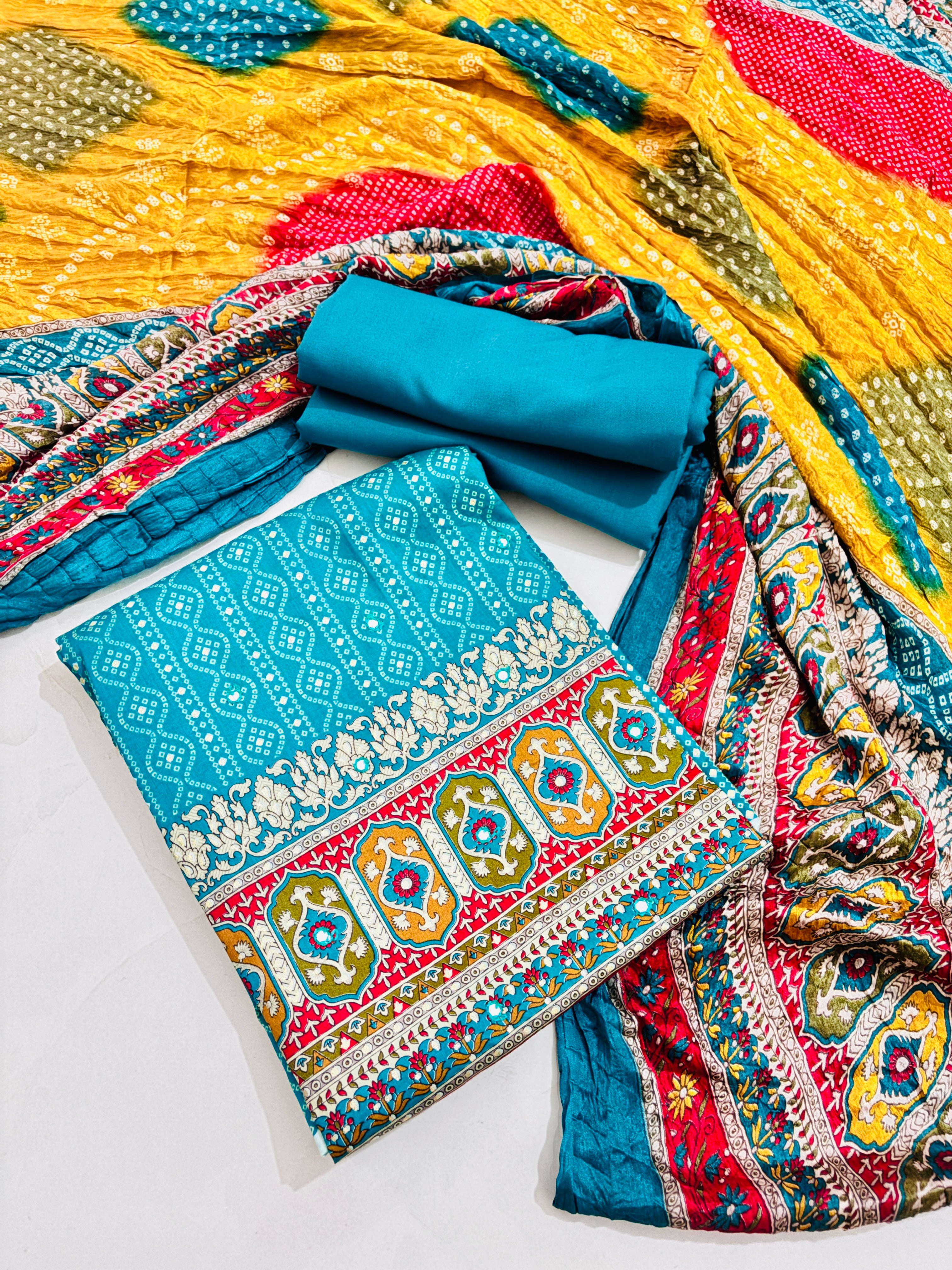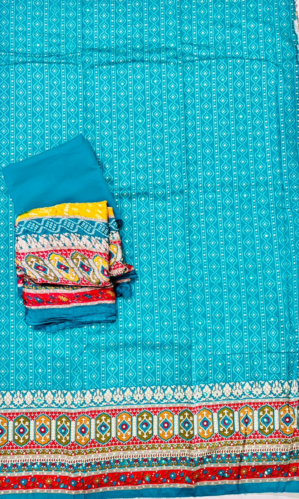 The outfit features a vibrant turquoise colour with intricate patterns, embodying traditional aesthetics.This outfit is suitable for festive occasions, casual gatherings, or cultural events, offering both elegance and comfort.This ensemble beautifully combines traditional elements with modern flair, making it a trendy choice for various occasions.Size fits upto xxxl