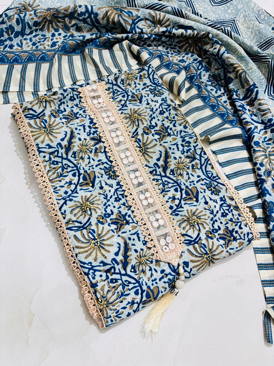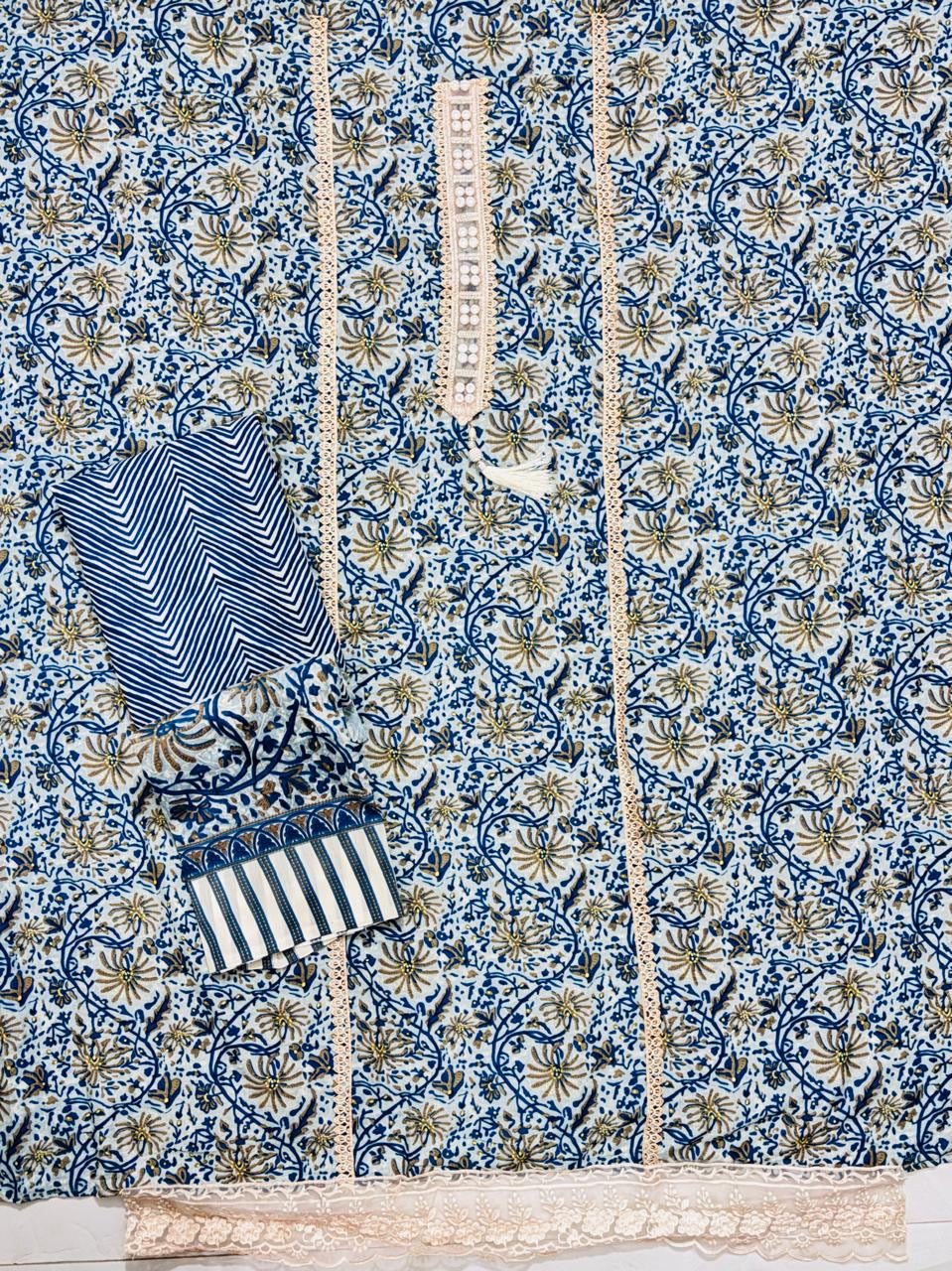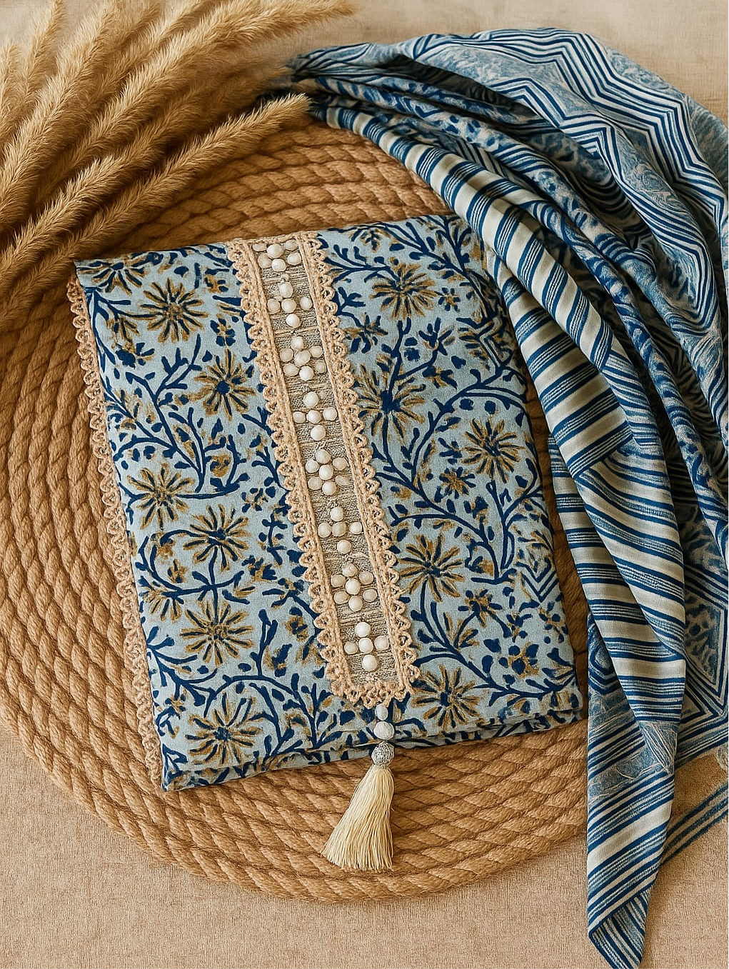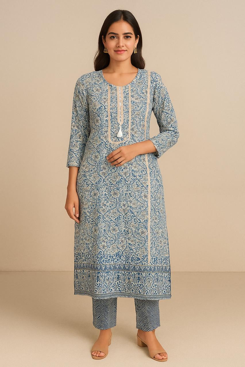 Step into effortless elegance with this beautifully crafted blue kurta set. Featuring intricate floral prints in soothing indigo tones, breathable cotton—perfect for all-day comfort.The kurta is paired with contrasting chevron-printed pants that add a modern flair while maintaining a traditional charm.Perfect for office wear. Size fits upto xxxl