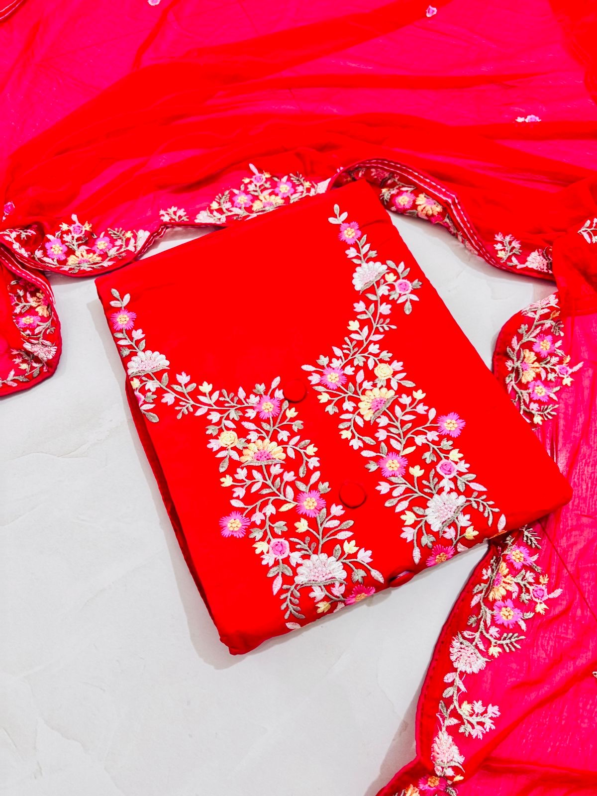 This beautiful ethnic dress material features a vibrant red base adorned with intricate multicolor floral embroidery on the front, showcasing delicate pink, white, and green thread-work.The design is rich and festive, perfect for special occasions or celebrations.Based on Kashmiri design makes it’s unique and stylish chiffon dupatta is perfect for this suit material.Pair it with minimal jewellery and embellished footwear for a graceful ethnic look. Size fits upto xxxl
