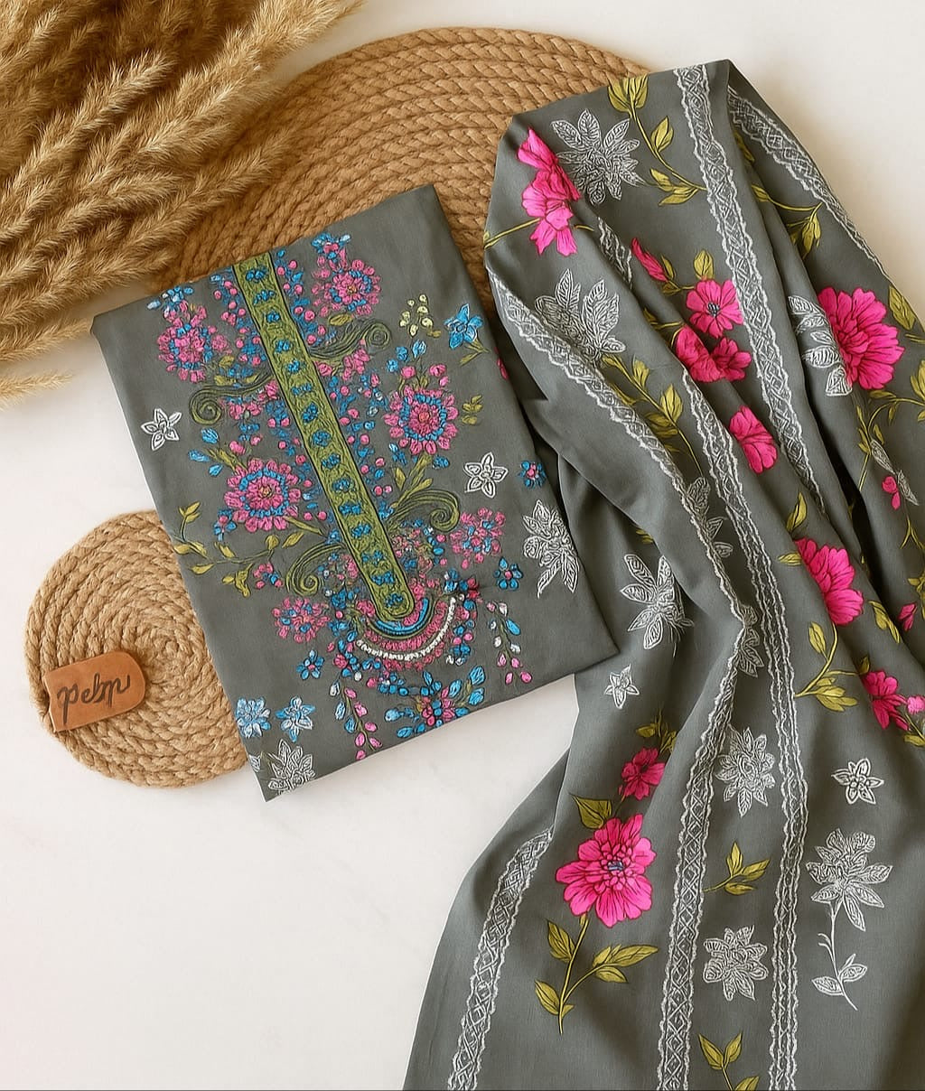 Soft grey cotton with vibrant pink, blue, and green floral embroidery on the front, highlighted by detailed thread-work and ornamental patterns.Premium quality cotton fabric for comfort and breadth ability.Versatile colour palette suitable for all seasons.Unstitched material allows for custom tailoring to your preferred fit and style.This suit set is ideal for those who appreciate timeless elegance with a modern twist. Size fits upto xxl